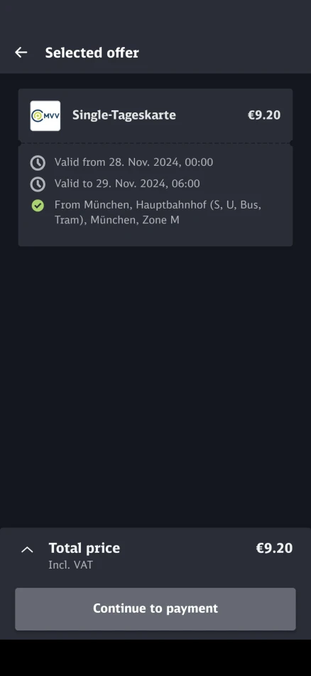 如果你很確定當天移動都在同一區(例如當天都會在慕尼黑的M區),那就可以輸入你要由慕尼黑中央車站到瑪莉恩廣場然後購買一日票,這時候買到的一日票就是適用於M區的,一開始輸入的出發地/目的地並不重要。