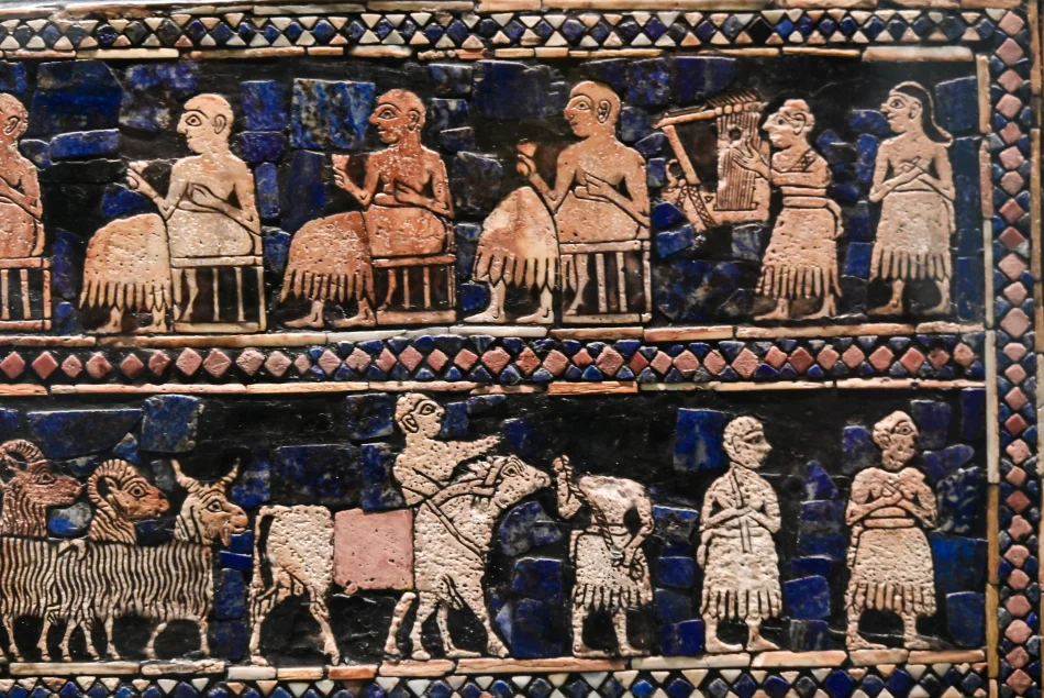 烏爾的標誌(The Standard of Ur)屬於蘇美文化的文物,是20世紀初期於蘇美皇家陵墓發現的。雖然是西元前2600年左右的文化,精雕細琢的程度讓人嘖嘖稱奇,一面是反映了承平時期的宴會,另一面則是戰爭場景。