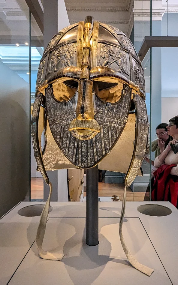 薩頓胡頭盔(The Sutton Hoo Helmet)屬於一位7世紀去世的盎格魯.薩克遜國王,是船葬的陪葬品之一,為國王的頭盔。細看的話頭盔還鑲有銀私,雖然現在看起來破爛不堪(附近有展示一個金碧輝煌的複製品),但經過上千年還能保存已屬不易,也是那時代僅存的四件完整頭盔之一。頭盔周遭還有陳列該國王的其他物件,例如:劍,算是我蠻喜歡的展品。