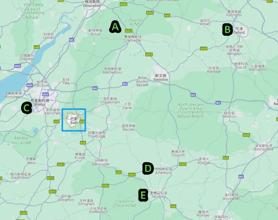 通常會跟巴斯一起安排的城鎮有牛津、布里斯托爾、索爾茲伯里等等。雖然近郊有巨石陣跟柯茲窩,但到這兩地的大眾運輸都不甚方便,這邊就不介紹了,只列出到下列城市的車程(分鐘)與概略票價(英鎊)。票價指的是購買兩週後中午時刻的最快列車,英國火車種類眾多,尖峰/離峰及多早之前購買車票都會影響價格,實際價格依你查詢當下為準。