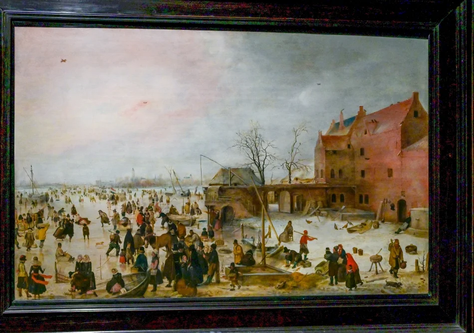 這幅畫的畫家是Hendrick Avercamp,他不像荷蘭三大畫家那樣名聲響亮,卻是我超推薦的荷蘭畫家,主題幾乎都是荷蘭冬天的冰上活動,當時歐洲遭遇小冰河時期,冬天經常霜天雪地。他的畫作都蠻有趣的,除了以透視法延伸視線,前景人物的活動多采多姿,雖是陰鬱的天氣卻充滿活力。
