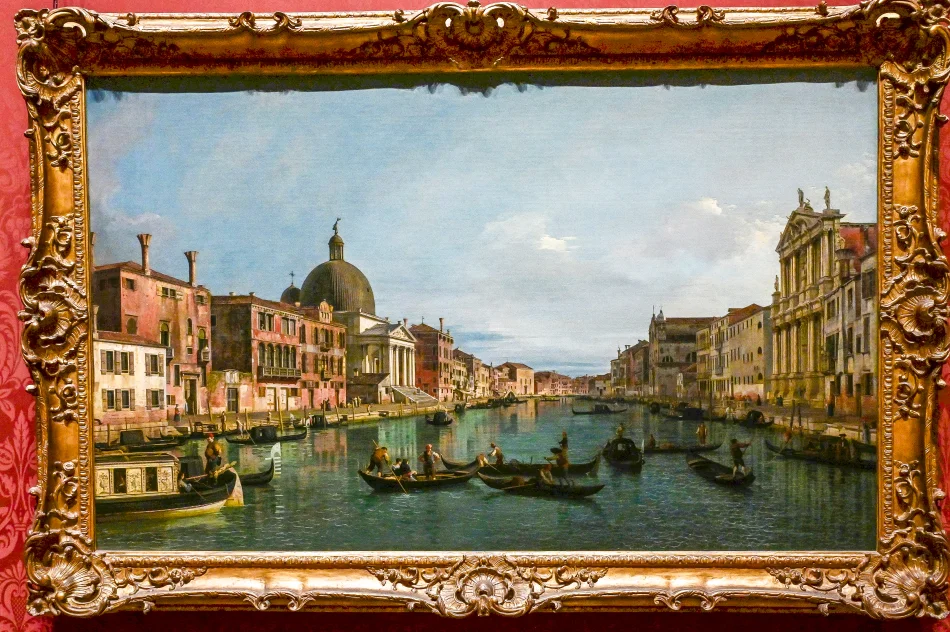 - 主題非常明確,大運河的日常生活搭配周遭的重要建築,例如當時落成不久的小聖西滿堂(左邊的圓頂教堂),它也是上一張畫最左邊的建築