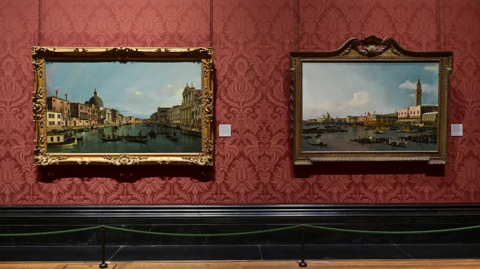 卡納萊托(Canaletto)跟拉斐爾、卡拉瓦喬並列為我最愛的三位義大利畫家,這三位風格截然不同,卡納萊托以精確的構圖與透視法聞名,最知名的主題是威尼斯(他畫的德勒斯登也是經典,歷代大師畫廊的重要典藏)。國家美術館有收藏一些他創作的威尼斯畫作,其中兩幅的視角是互為相對位置,但我看不出來就是了。