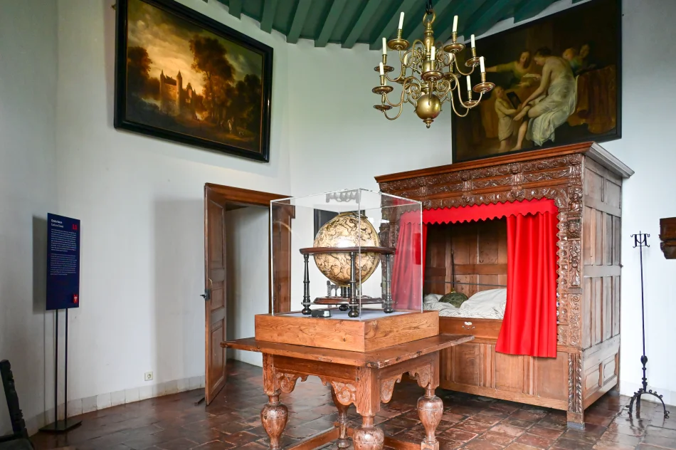 這是導覽機介紹的最後一個展間、PC Hooft的起居室。裡面最顯眼的是床,一來是床很小,當時的人習慣坐睡,因為他們認為躺下來會讓血液流到腦部、造成健康問題;二來是床很高,這是因為當時沒暖爐(或者就寢時不能使用),墊高的床可以避開地面的濕氣與低溫。中間還放了一個地球儀,雖然跟PC Hooft頗符合,但不確定是本來就有或者修復建築時陳列的。