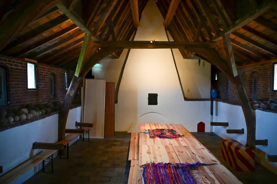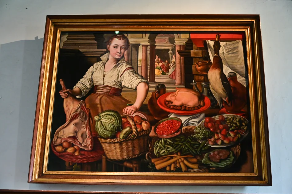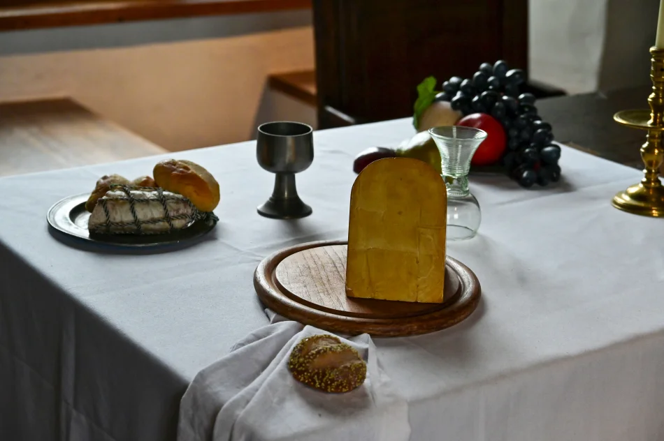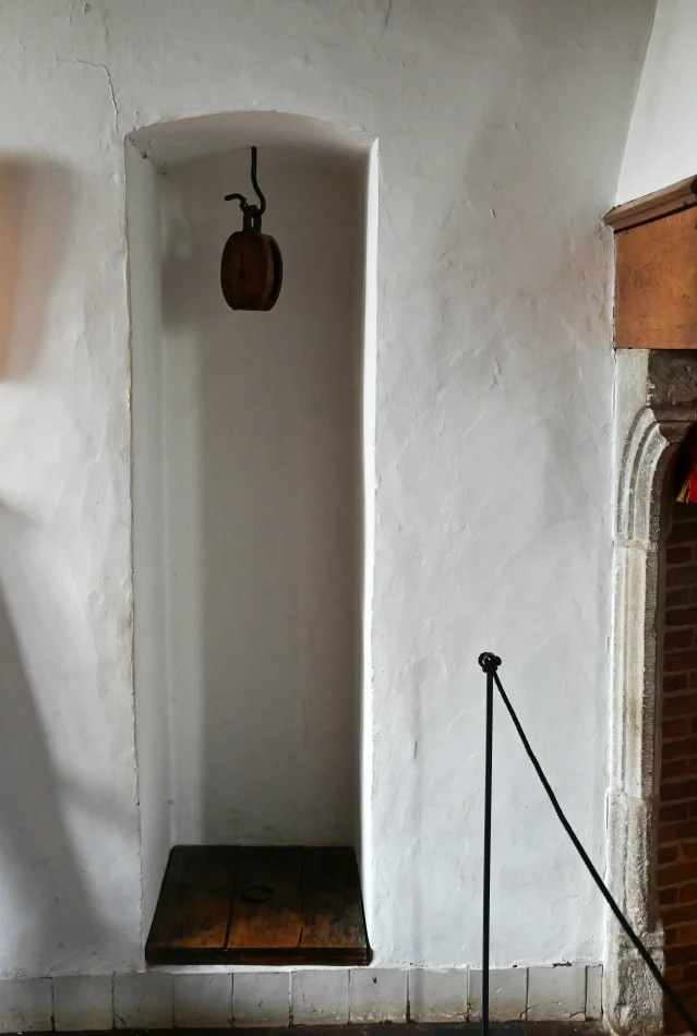 廚房旁邊的房間就是日常用餐的地方,桌上擺放早餐的器具與食物模型,牆上的掛鉤很奇妙,那直通酒窖,酒沒了將罐子降到酒窖、添滿後再拉上去。以前連小孩都會喝酒,因為難以取得乾淨的水。但另有一說是…他們其實也蠻常喝水的,只是平常根本不會記錄水的消耗只會紀錄酒,所以形成了一種古人只喝酒不喝水的錯覺。