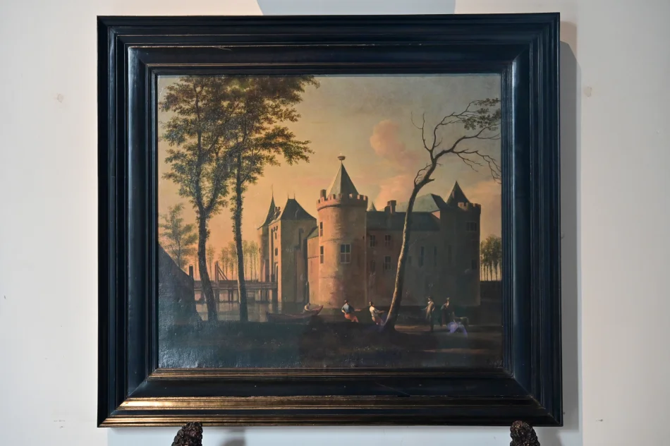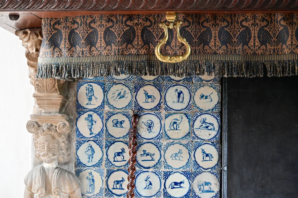 騎士大廳(Knight’s Hall)是穆登城堡最核心的部分,也是招待達官顯貴的主要場所,荷蘭國王-威廉-亞歷山大也是訪客之一,桌面上有本訪客留言簿供顯貴訪客簽名。房間除了許多畫作,還有個顯眼的壁爐,除了讓人目不轉睛的青瓷(不曉得是否為台夫特的),還貼心的設置黃銅把手,讓人暖腳時可以扶著,不會因重心不穩而跌向壁爐。