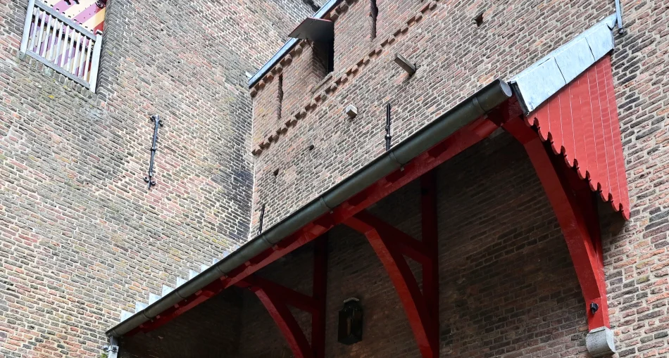 這是城堡最高處,陡峭的屋頂可以讓積雪與水立即滑落、不會造成屋頂的負擔,裡面以巧妙的彎曲木樑拉高屋頂、擴大使用空間,這種木頭在16世紀就停產了。這邊最奇特的是牆上置放木樑的孔洞,戰時推到外面便形成臨時走道,平常則隱藏在室內,非常奇妙!