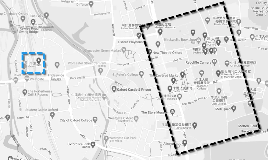 牛津市區景點非常集中,下圖的藍圈是牛津火車站、黑圈是市區主要景點位置,由火車站步行到觀光區域入口–卡爾法克斯塔約15–20分鐘,各景點詳細位置請參考我整理的牛津景點位置圖。