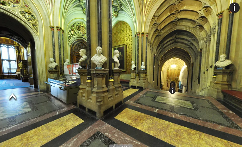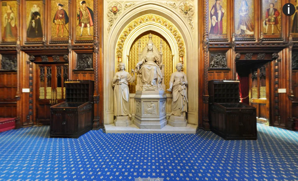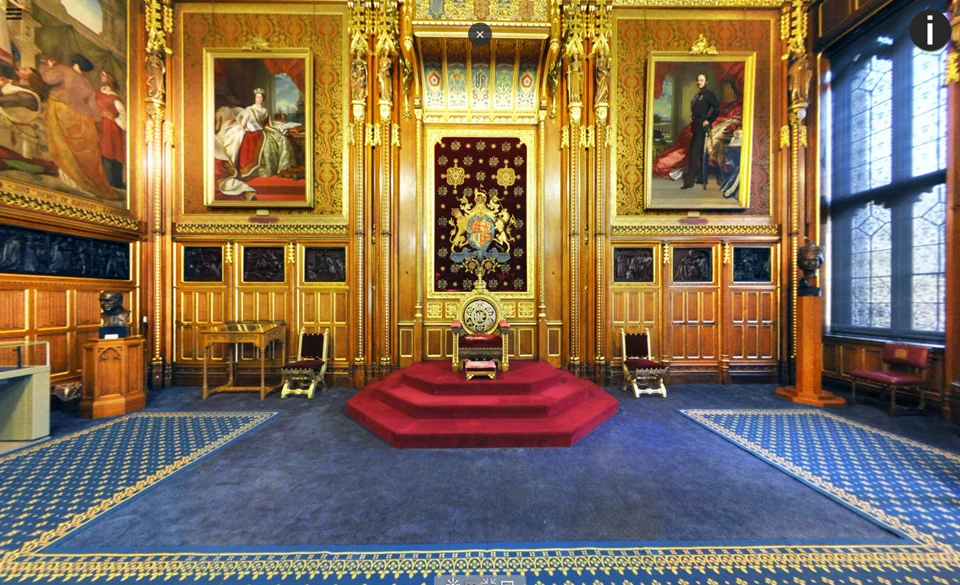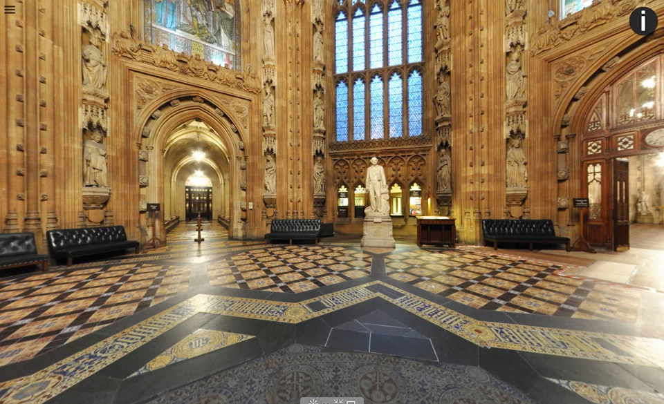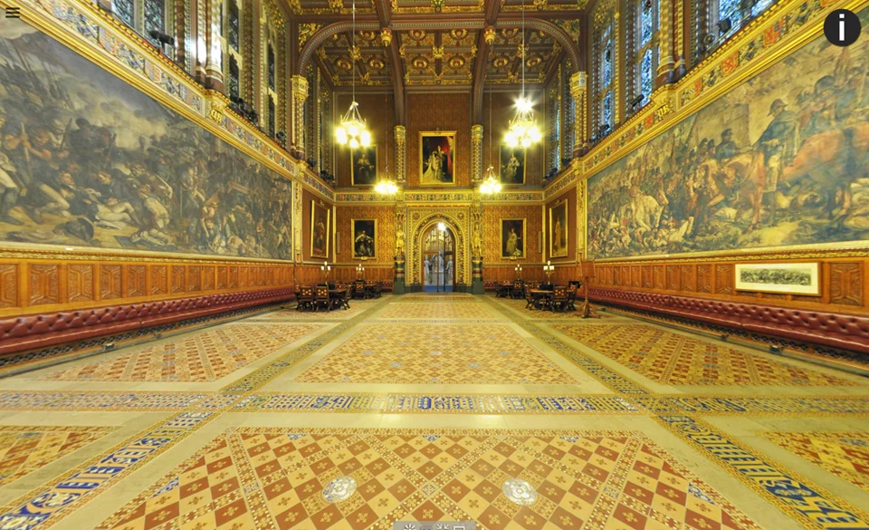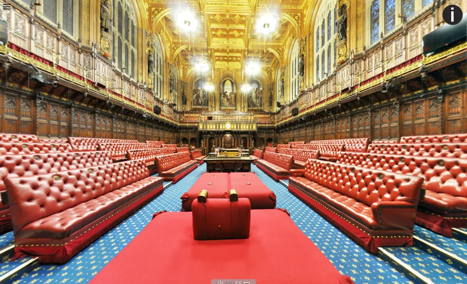 - The Lords Chamber:上議院(House of Lords)的開會地點,椅子為紅色、代表忠誠,也是君主於國會開幕大典(State Opening of Parliament)發表致詞的場所