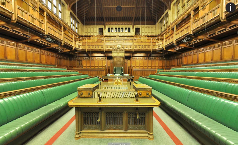 - The Commons Chamber:下議院開會地點、君主禁止進入,國會開幕大典時會有人至這邊邀請議員(Members of Parliament,即:MPs)去The Lords Chamber聆聽國王致詞,要敲三次門才得其門而入,這傳統跟前述的查理一世想逮捕下議院議員有關
