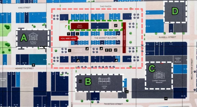 這邊會先介紹柯芬園市集與廣場(Market Building & Piazza)的位置圖,然後分享我隨走隨拍的市集外圍、內部以及用過餐廳的地方。市集內的商店八點後就會陸陸續續的關門,不要太晚過來!開始前先介紹重要資訊: