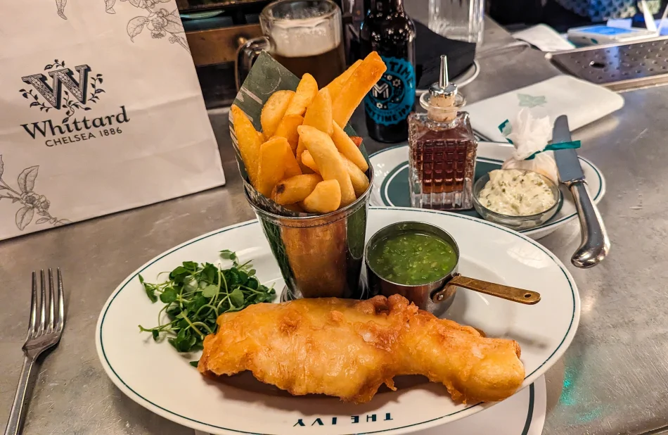 Flat Iron附近還有倫敦常見的連鎖餐廳『The Ivy Market Grill』(Google Maps位置圖),算是中規中矩的英式料理餐廳,不會踩到雷但也不到驚艷,我便是在這邊吃了英國之旅第一頓晚餐:它的炸魚薯條。The Ivy的炸魚蠻嫩的,但薯條就很普通,我覺得在歐洲吃到的多數薯條都很一般般就是了,偏乾。