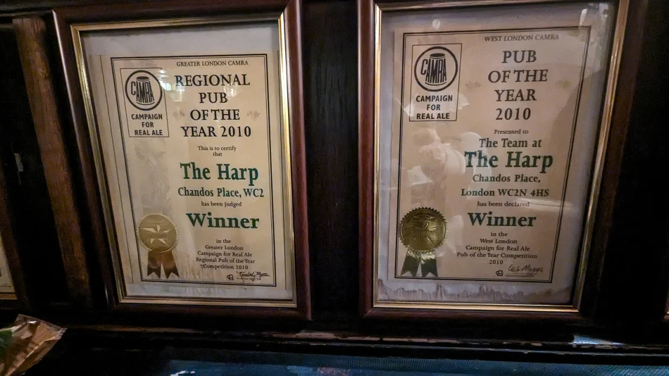 想喝點小酒的話推薦去附近的『The Harp』(Google Maps位置圖),我是某天晚上參觀完附近的博物館後到這邊喝精釀啤酒,生啤的種類還算多而且品質不錯,值得一訪,看它的生意以及Google Maps上的評論,應該也算是這區域的名店吧。順帶一提,到英國酒吧如果想喝多一點種類的生啤,可以跟他們說要半品脫(half pint),我蠻常這樣喝的,當然瓶裝或罐裝的就不能這樣點了。
