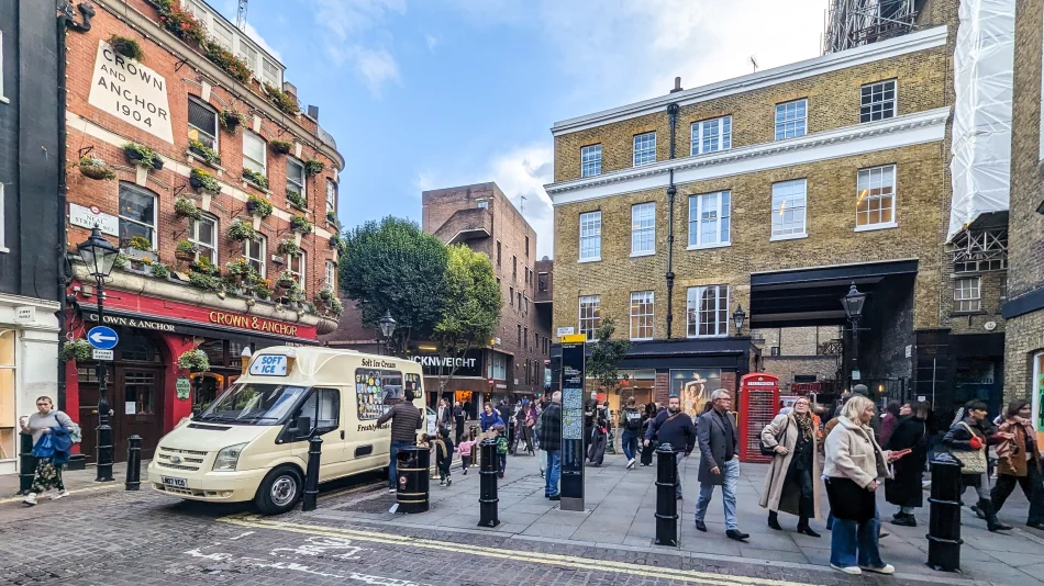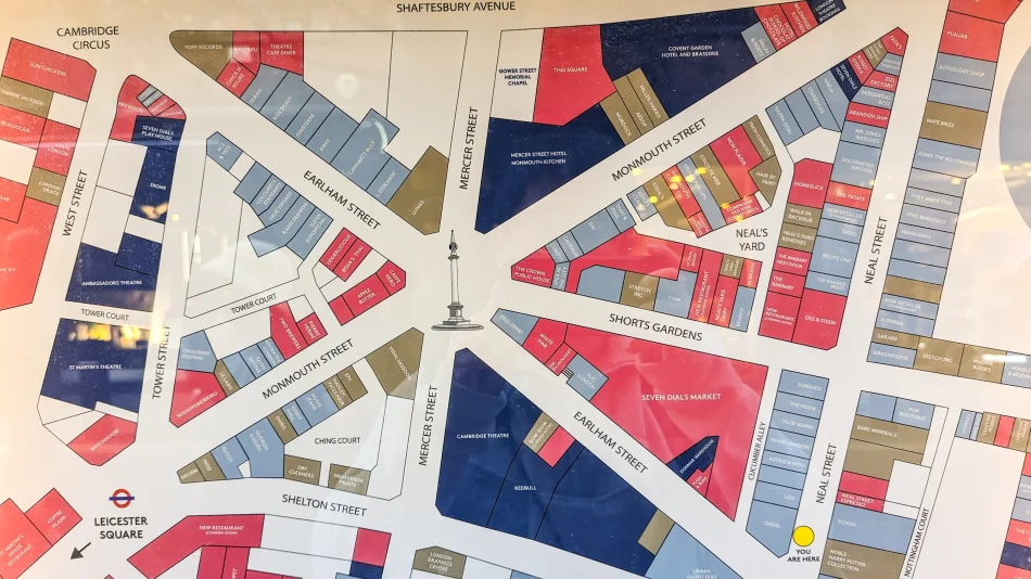 現在的街區已經與當時的樣貌截然不同、成了倫敦知名的文青區域之一,典雅的小店林立。它剛好位於柯芬園與大英博物館中間,步行到這兩地各約6–8分鐘,又有美食廣場『Seven Dials Market』(Google Maps位置圖),是很不錯的用餐地點。