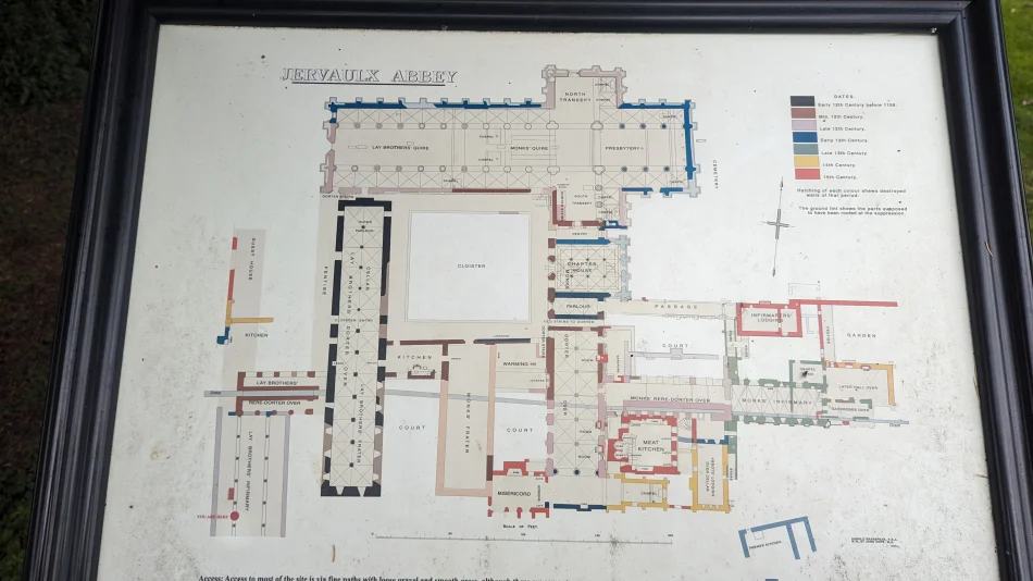 Jervaulx修道院(Jervaulx Abbey,Google Map位置圖)也是在亨利八世時期被廢棄的修道院之一,這修道院的歷史可以追溯到12世紀,一直是當地的信仰中心,於1537年被廢棄後轉手過多次,直到1970年代才在擁有者家族的規劃下對外開放。