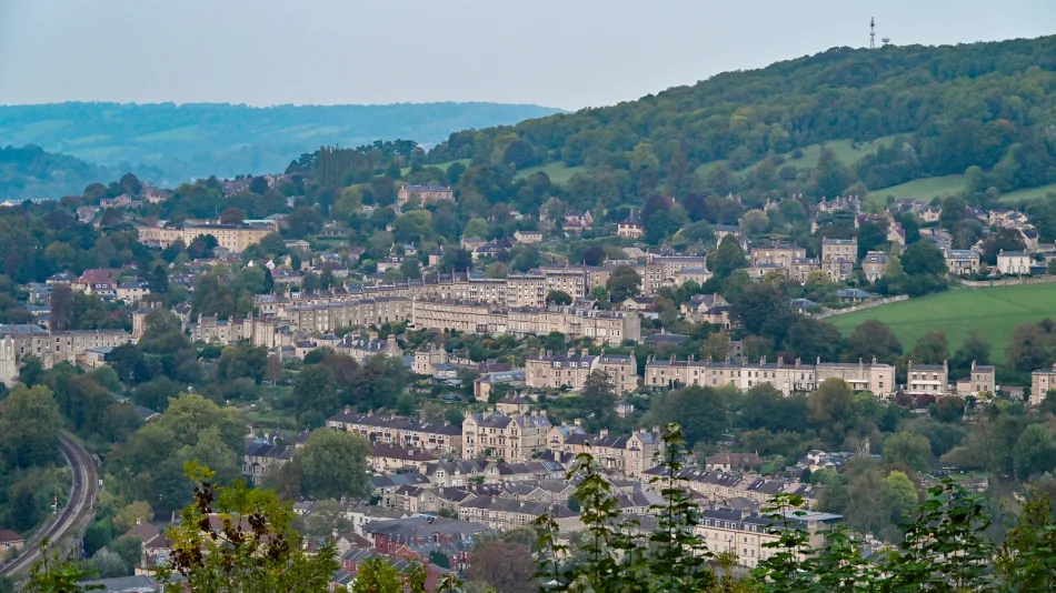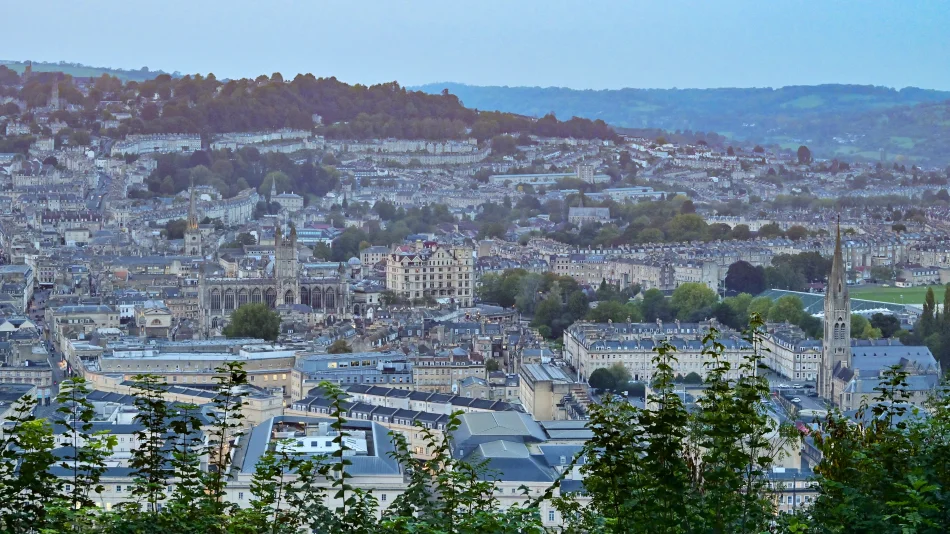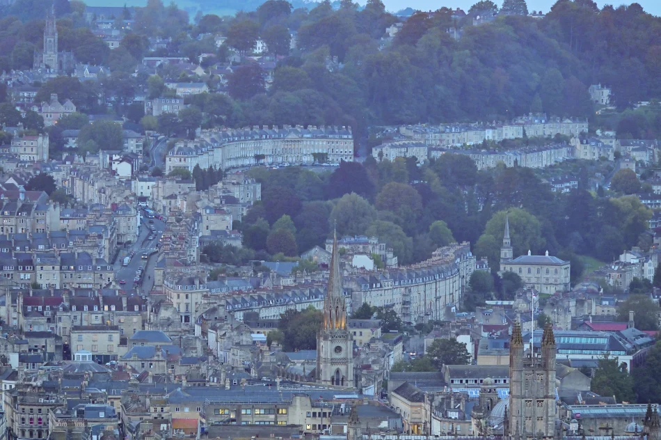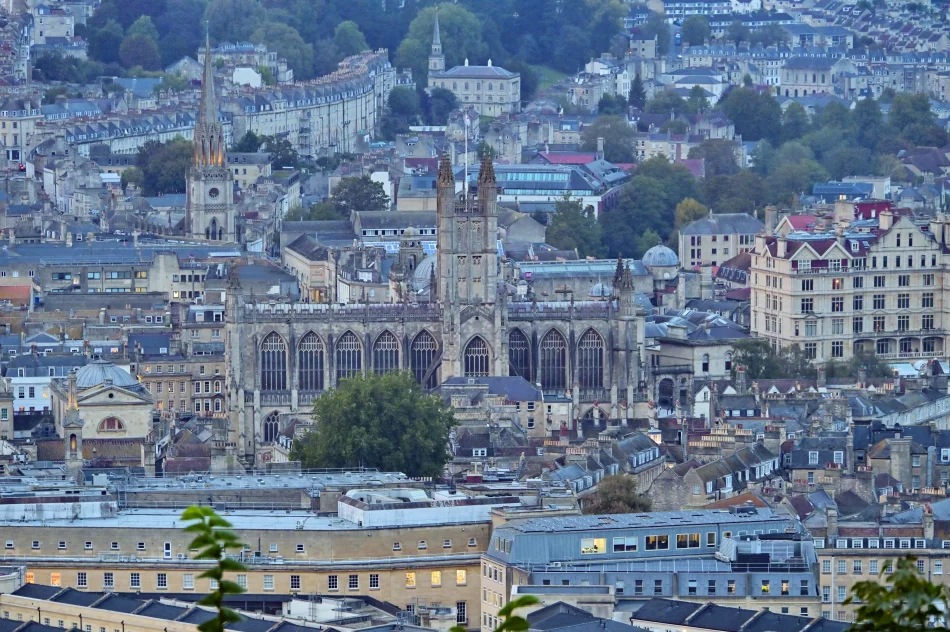 遠眺巴斯市區時建議先找出地標:巴斯修道院教堂,左邊低矮、有圓頂的建築是巴斯羅馬浴場;修道院教堂右邊可以看到一棟比較高聳的建築,那是帝國飯店(Empire Hotel),往前走一小段路就是前面有介紹的普爾特尼橋,由這邊是看不到的。