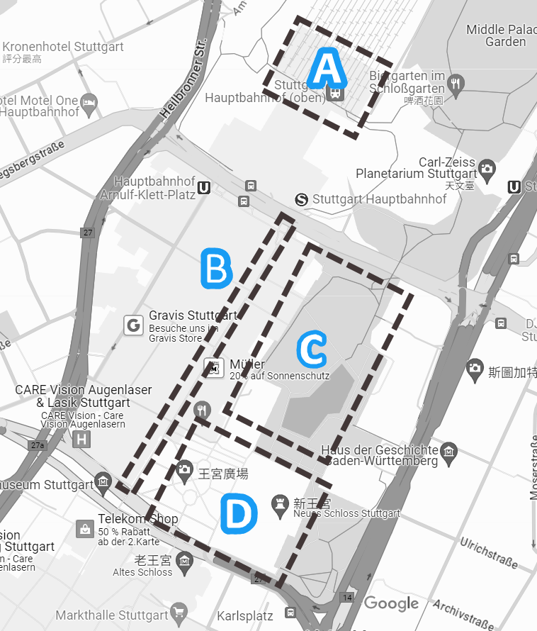 本文介紹的景點算是位於斯圖加特市中心的北邊,其中最北的是斯圖加特中央車站,往南是國王大街、王宮廣場等等。