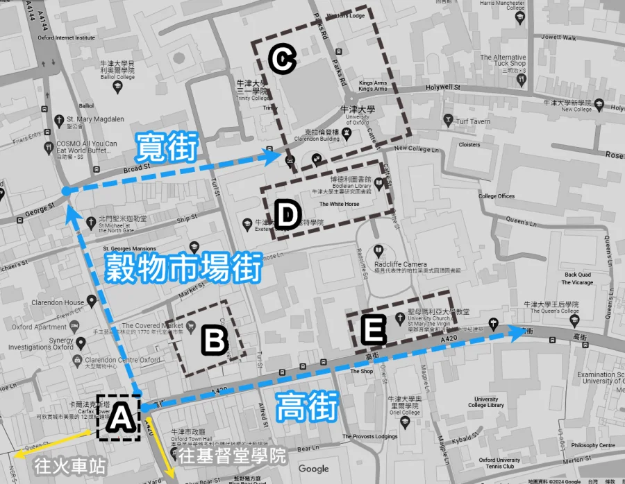 如果以卡爾法克斯塔(下圖的A)為中心點,本文介紹的景點都位於它的東北方(第四象限),基督堂學院位於它的東南方,而火車站則位於卡爾法克斯塔西邊步行約15分鐘的地方,完整地圖請參考我整理的牛津景點位置圖。