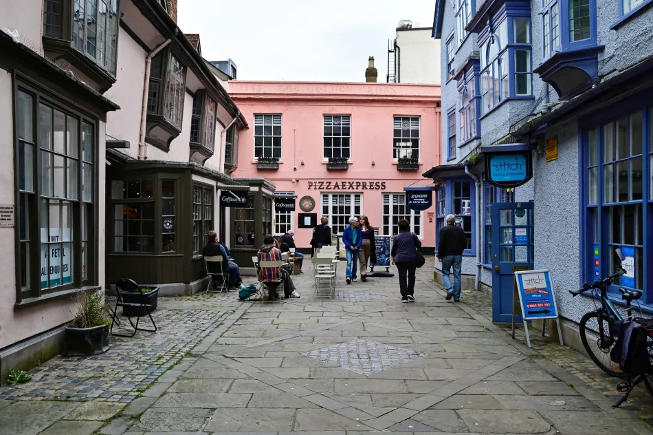 卡爾法克斯塔往北是穀物市場街(Cornmarket Street),算是市中心最熱鬧的區域,沿途餐廳林立,也有我蠻喜歡的便宜日本料理:itsu。街上有個顯眼的高塔,那是屬於北門聖米迦勒堂,曾經關押牛津殉道者,旁邊有棟超古樸的木質骨架建築。
