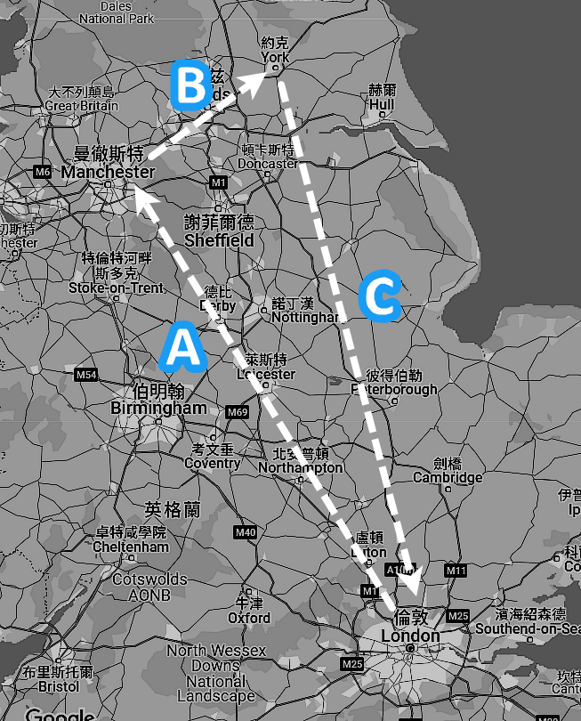 因路線選擇眾多,這邊就不供建議路線、請以上述網站查詢,倫敦–曼徹斯特約2.5–3小時,曼徹斯特–約克約1小時、約克–約克約2–2.5小時,都有直達車。