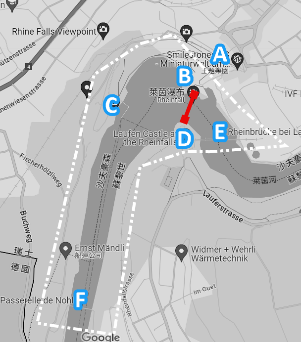 以下是萊茵瀑布周遭景點位置圖,紅線是萊茵瀑布、水流方向是東往西(即:E⇒C),周圍白線則是瀑布的步行環遊路線(Rundweg/Circular Route,我沒這樣走),可由 Rheinbrücke bei Laufen跟Passerelle de Nohl 渡河!