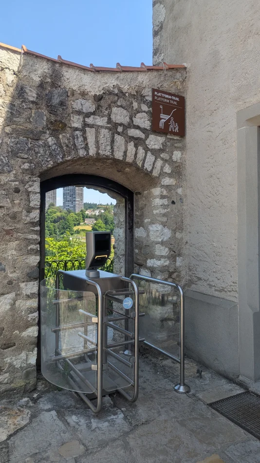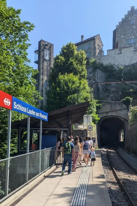 由 Neuhausen Rheinfall 到這邊需要搭乘 S Bahn 到 Schloss Laufen am Rheinfall 站(Google Map位置圖)而且要轉車,但蠻近的。下車之後跟著人潮走就會看到一個電梯,旁邊有售票機,請先買票然後搭電梯到上層的城堡,電梯不用錢,當然也可以走到城堡。