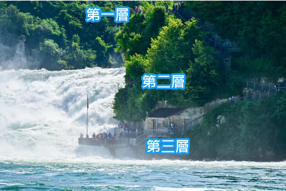 瀑布西側是我最推薦的拍攝角度,可由正面欣賞這個歐洲最大瀑布的千軍萬馬氣勢,雖然離瀑布遠了點,但反正等等就可以搭乘遊船近距離體驗!比較推薦的鏡頭當然是旅遊鏡,可以仔細觀賞瀑布的結構:中間矗立兩顆石頭、將瀑布分為兩段,南邊則是 Schloss Laufen am Rheinfall,那邊的觀景台是下一站。仔細觀察 Schloss Laufen am Rheinfall 可以發現分為三層,等等介紹。