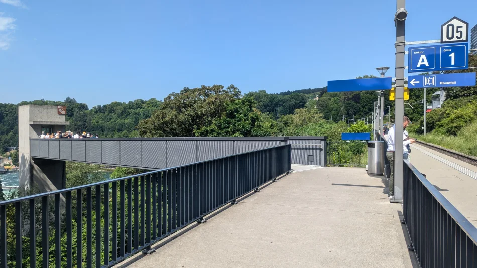 由蘇黎世搭乘 S Bahn 到 Neuhausen Rheinfall(Google Map位置圖)約50分鐘,是我的萊茵瀑布一日遊第一站,下車之後可以搭乘電梯或者步行到岸邊(請用Google Map 規劃路線)。車站位於高處,如果步行到碼頭可,沿途可以居高臨下的俯看瀑布,雖然景色不如岸邊,但還不錯,也可以對週遭環境有大概理解。