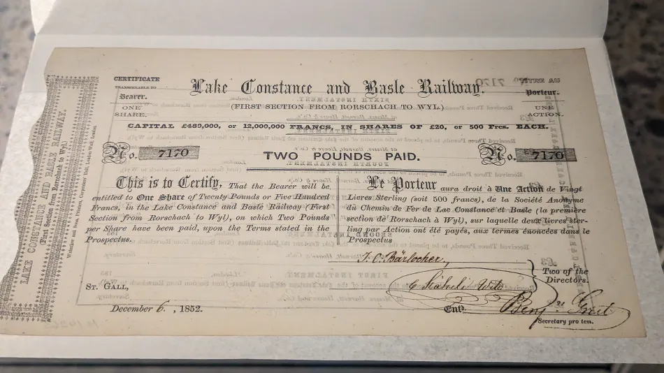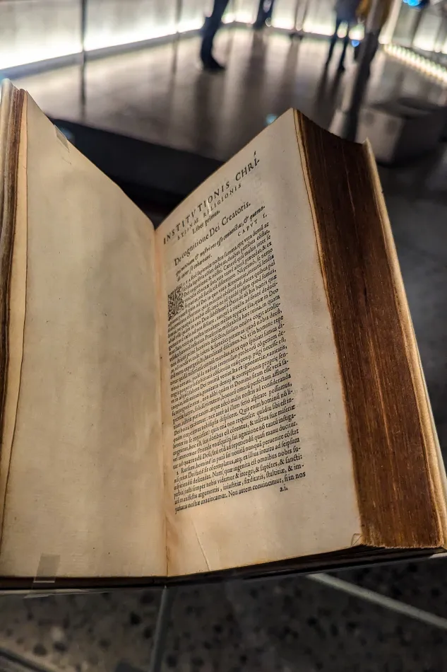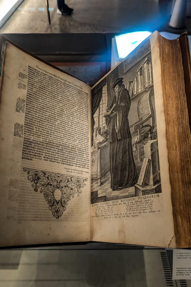 其他就是展示一些紙本文物,例如喀爾文(Calvin,喀爾文教派始祖)的《基督教要義》及荷語版、很早期的瑞士鐵道股票(英國人買很多)。