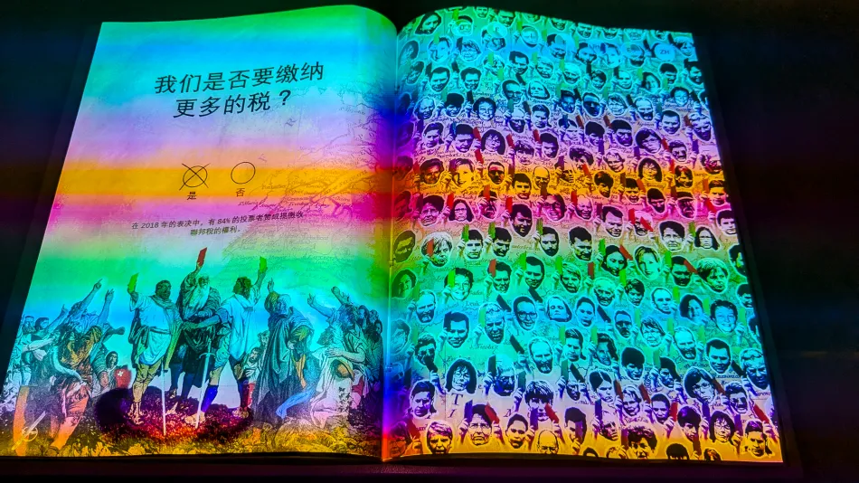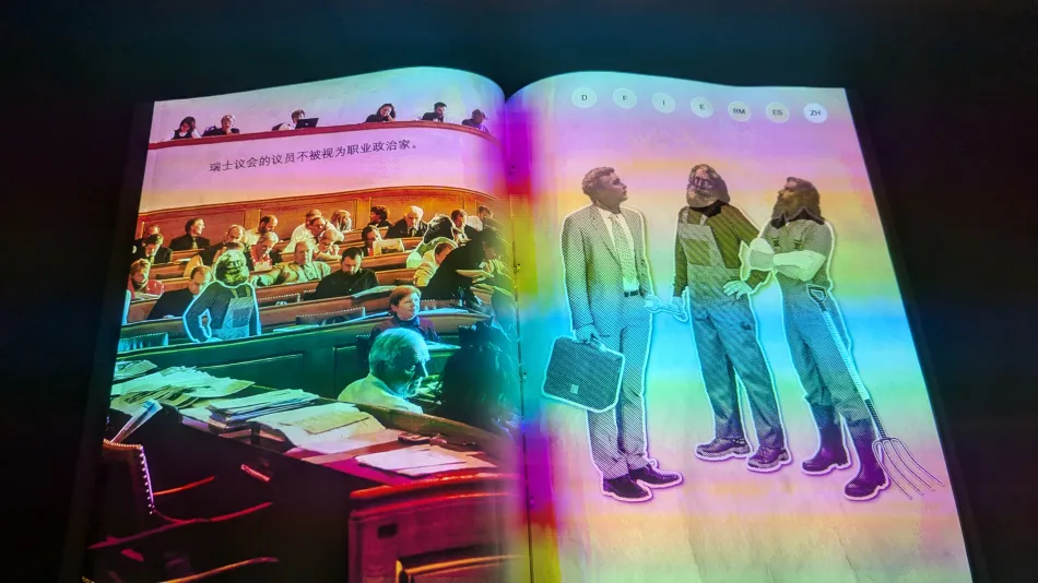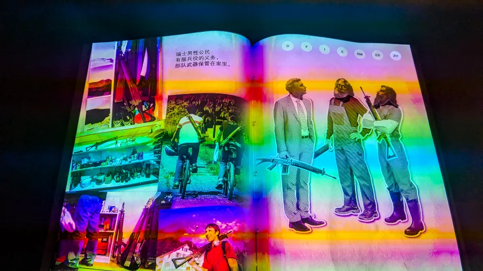 裡面有一本多媒體書籍,翻頁之後會顯示一些有趣的內容,例如…瑞士人是否投票通過加稅,也會說明瑞士的生活,例如:國民有服兵役的義務,家中會保存武器,又或者…瑞士各邦的稅制不一、彼此會競爭吸引他人,又或者…瑞士很晚才開放女性投票。
