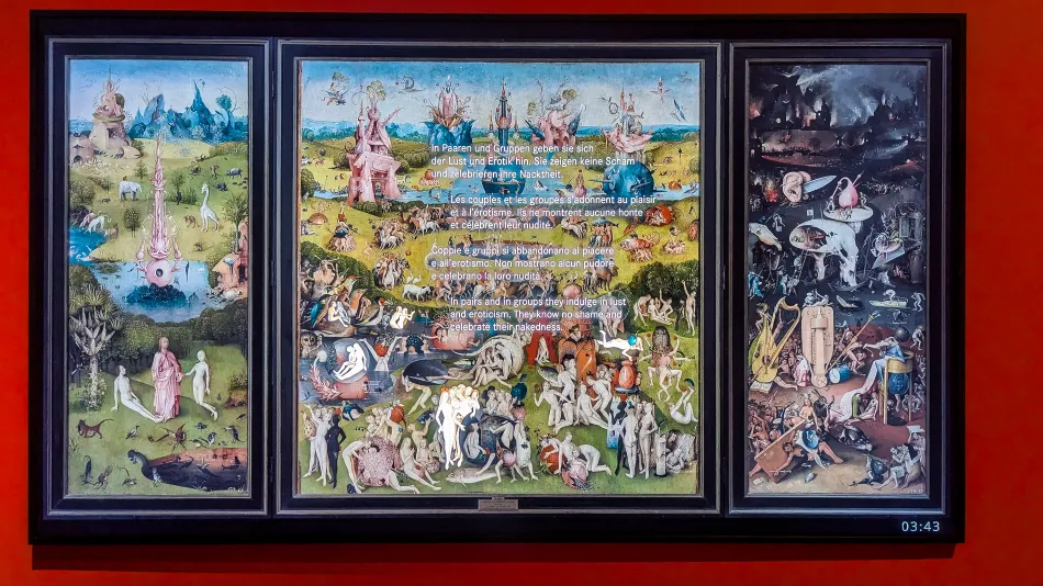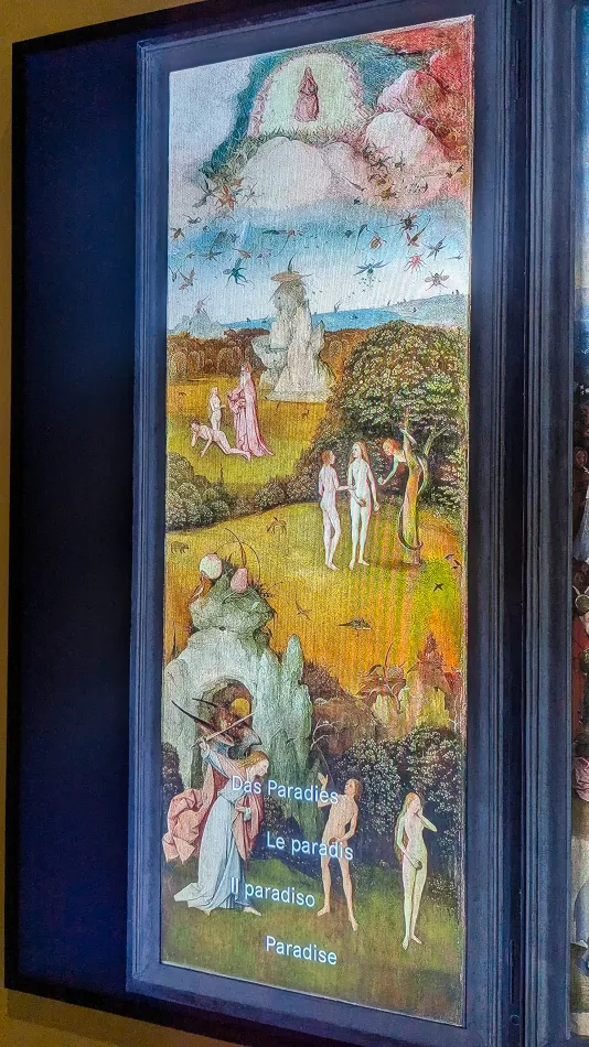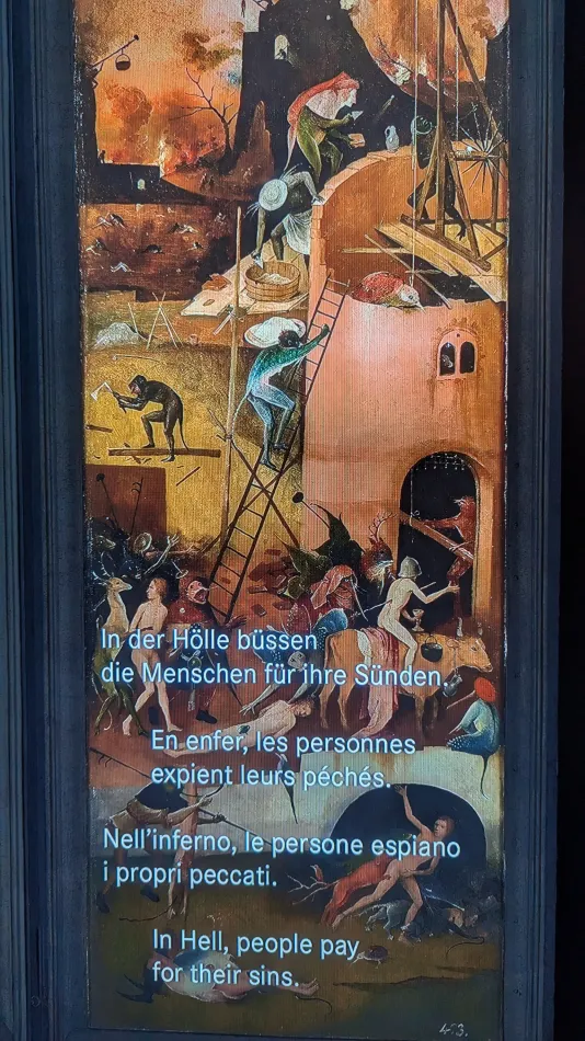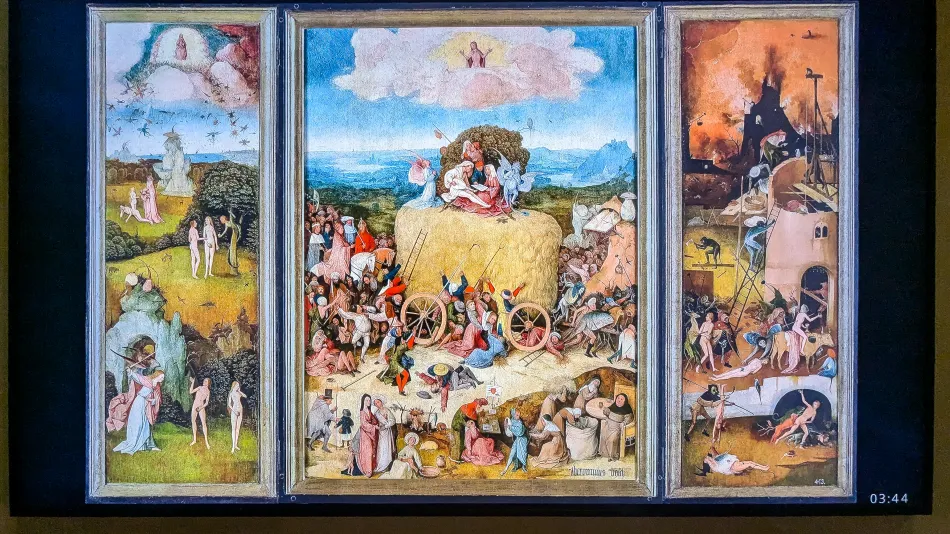 《The Haywain Triptych》主題概略可以分成天堂、人世與地獄,運用了很多象徵性的手法訴說人的缺陷,這一點跟老布列哲爾蠻像的,博物館也有展示另一幅名畫《人間樂園》的多媒體版本。