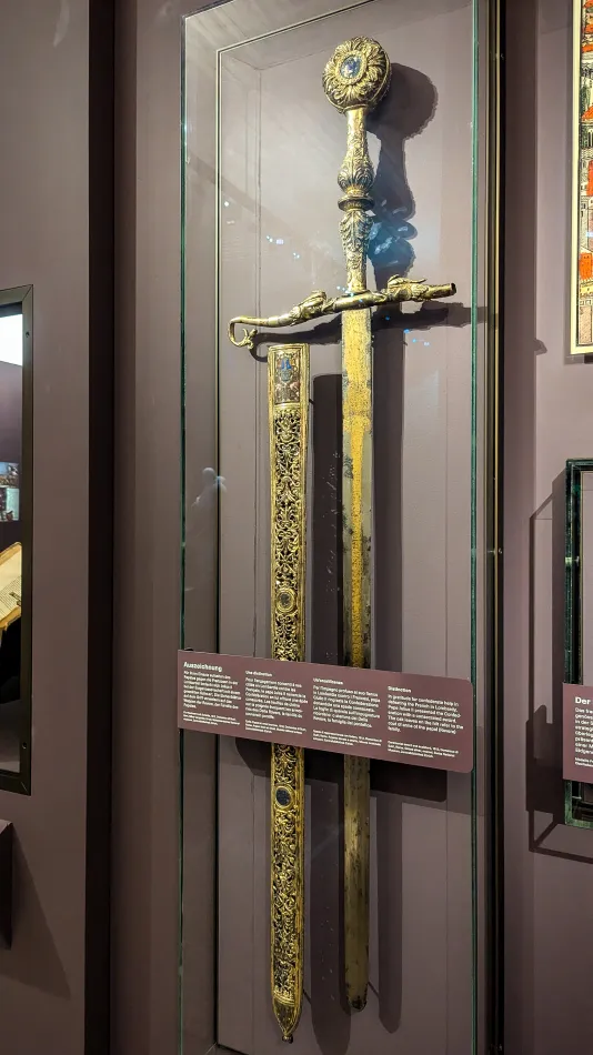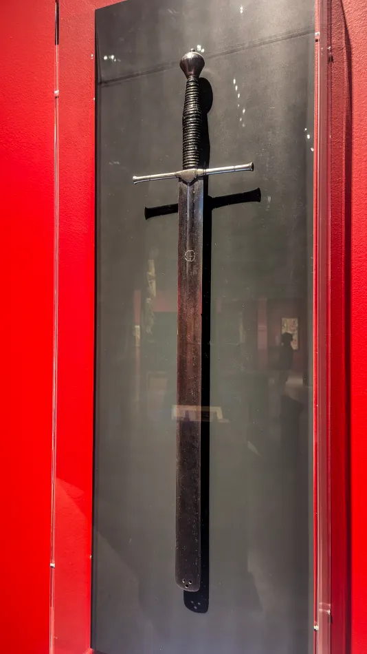 這邊有陳列一把劍,劍首很鈍,因為是用來斬首的,以前執行死刑的方式千奇百怪,最「慈悲」的方式就是斬首,因為犯人可以早早解脫。這把劍的陳列位置就在耶穌殉難相關文物附近,因為這區域還會介紹其他殉道者的故事。
