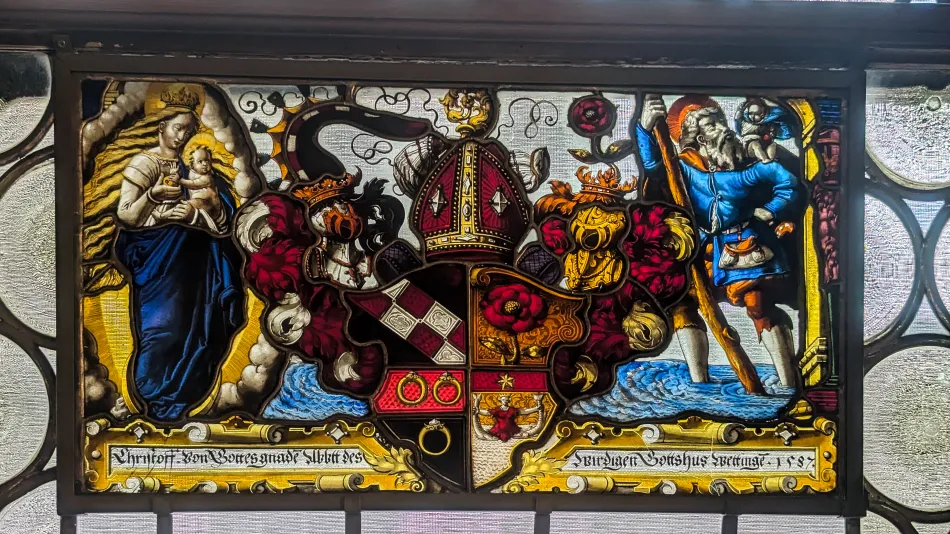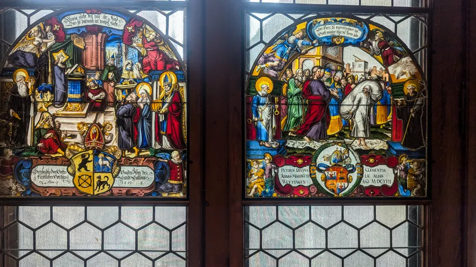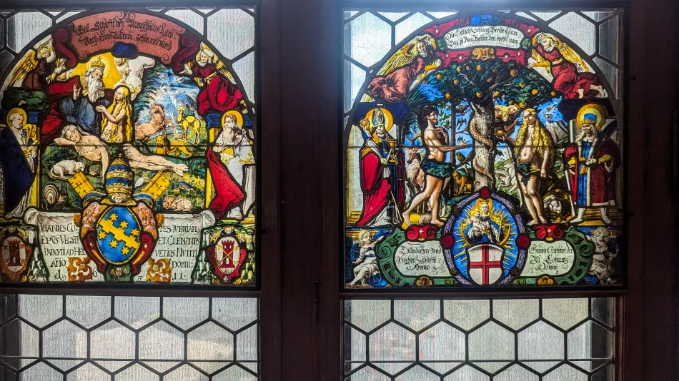 這邊有區走廊展示超多彩繪玻璃,這些玻璃可以追溯到16世紀、主題是舊約與新約聖經,非常推薦好好欣賞,難得有機會可以近距離欣賞彩繪玻璃,還附上豐富的解說。平常在教堂的彩繪玻璃都密密麻麻,距離又遠,根本看不出所以然!