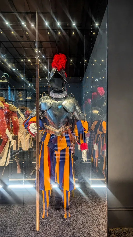 瑞士以前以驍勇善戰的瑞士衛隊聞名,博物館也有展出各區域瑞士衛隊的制服,「各區域」指的是荷蘭、法國、教廷等等,瑞士衛隊是熱門的傭兵來源。有趣的一點是…法國與荷蘭的制服不一樣,這樣打仗時才認得出來,這兩國在路易十四時期經歷了很長一段時間的鬥爭。