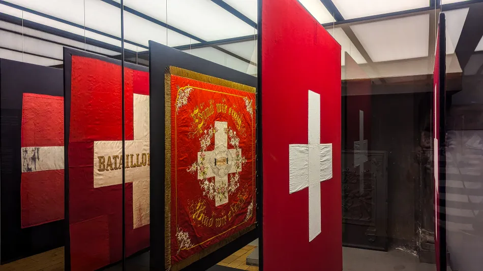 這邊的主題包含西元前的考古文物、瑞士名人肖像、瑞士家庭生活器具與陳設、瑞士相關宗教文物、瑞士衛隊等等,包羅萬象,我只挑有印象的,第一個就是瑞士國旗。瑞士國旗辨識度很高,基礎都是紅底搭配白色十字,象徵意義是民族自決、中立、穩定,現在國旗的十字是於19世紀定稿。