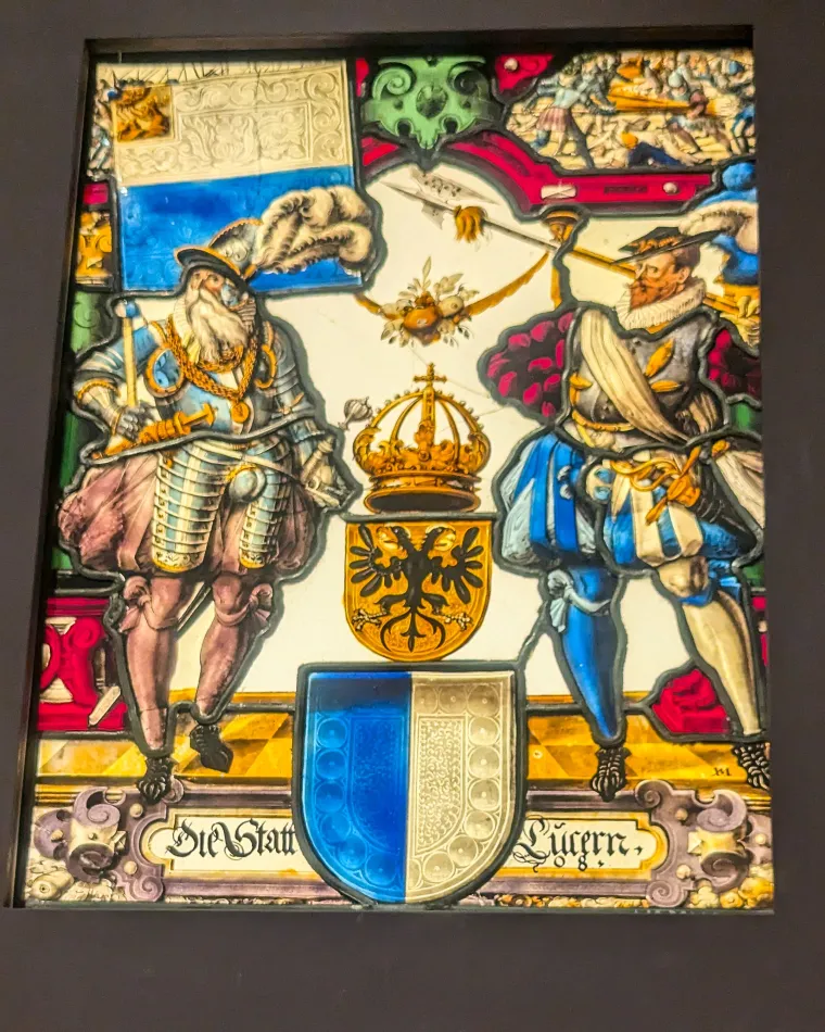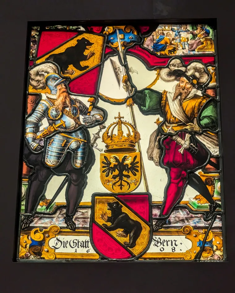 - 舊瑞士聯邦彩繪玻璃:瑞士是由13個州構成的聯邦,每個州都有自己的紋章,最好認的就是柏恩的熊。除了展示各州紋章,還有繪畫呈現各聯邦代表齊聚一堂開會的狀況