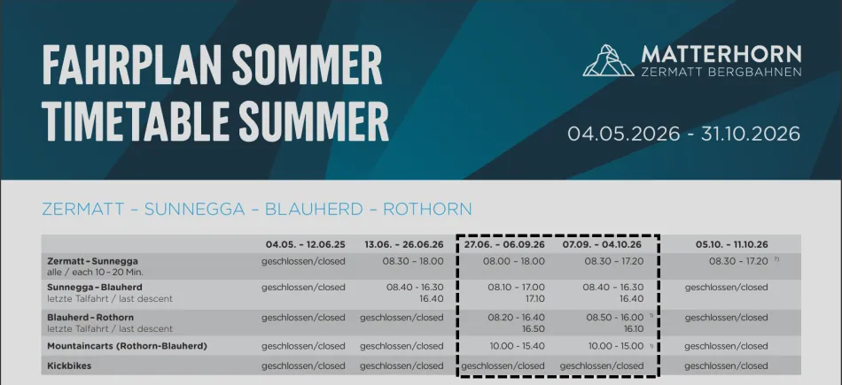 如要健行,強烈建議先看一下五湖健行相關交通工具的開放時刻,在夏天時刻表中可以搭到 Rothorn 的時候走訪,次之則是可以搭到 Blauherd。如果選擇在只開到 Sunnegga 的時候去,可以走多遠就…看運氣了。
