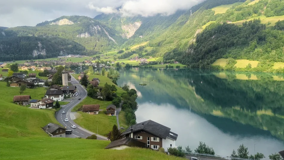 在列車經過的五個湖泊中,最讓人賞心悅目的是因特拉肯北邊的布里恩茨湖以及行程中間的龍疆湖,由因特拉肯到琉森時建議坐右邊,這一側比較好欣賞那兩個湖泊。列車在龍疆的前一站(Meiringen)停靠後,原本的車頭會變成車尾,所以原本坐右邊就變成左邊了,很奇妙。另一個我很喜歡的站點是 Giswil,可以居高臨下俯瞰山腳的村莊!