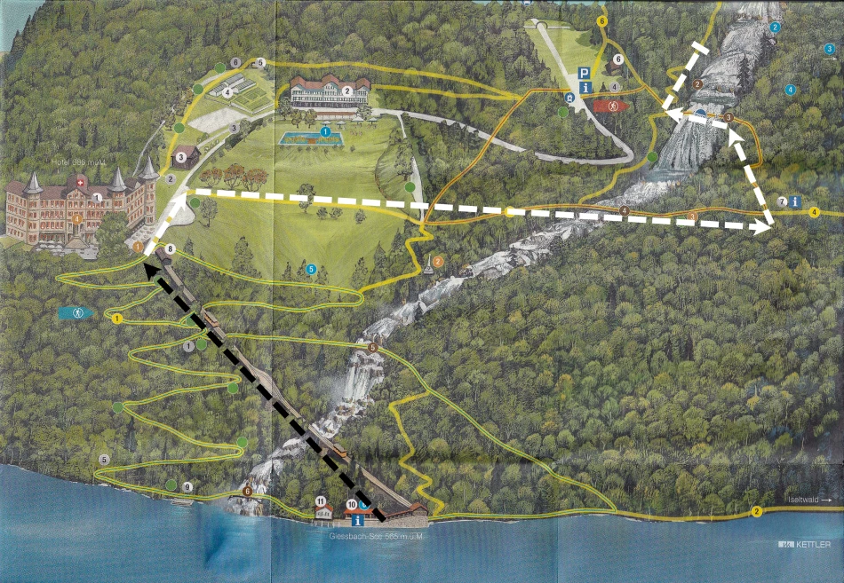 我是搭乘齒軌列車到上方的四星飯店:Grandhotel Giessbach,由那邊步行到吉斯河瀑布。