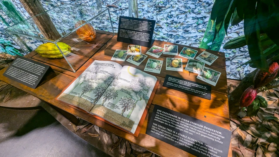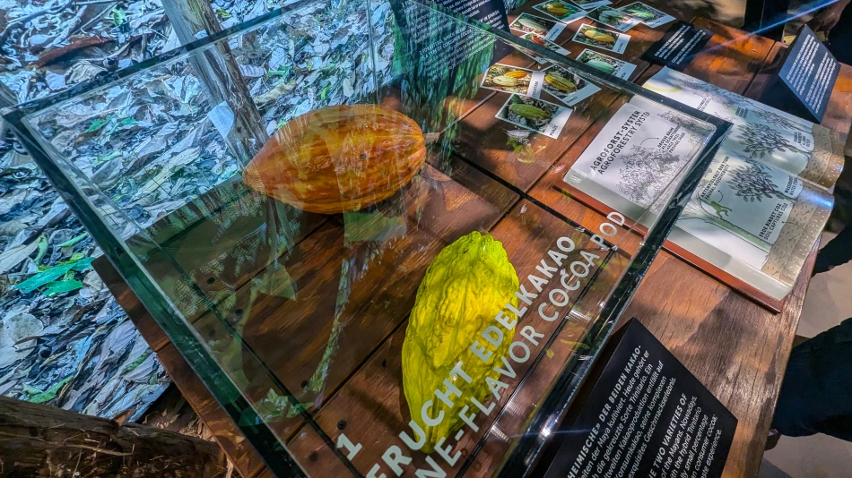 導覽的第一站是介紹可可豆的植栽概況,目前可可豆主要產地是赤道國家,例如象牙海岸、迦納、印尼等等。雖然可可豆算是大宗物資,直到現在都還是超級勞力密集的產業、機械化程度不高,可可豆來自於低矮的可可樹,彼此距離不可太近以免競奪地力,當然也跟樹根的型態有關。用器具取下合適的豆莢之後需要經過適當的處理才能取出可可豆,非常費工。