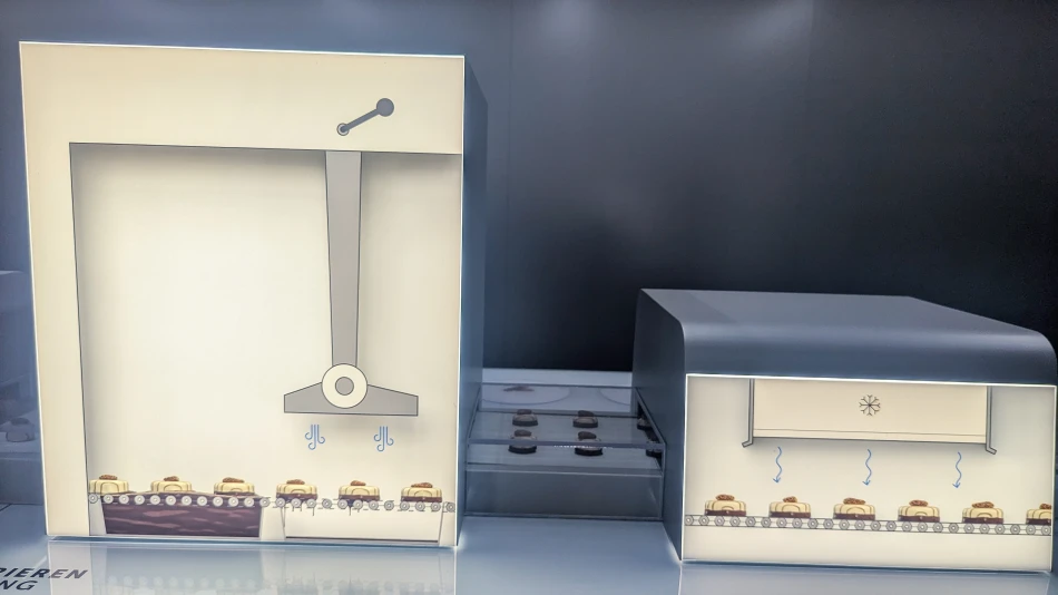進到詳細說明巧克力製程前,會有一小區展示櫃陳列各種瑞士巧克力包裝,包含瑞士蓮經典的金色兔子、三角巧克力的馬特洪峰包裝等等。受限於瑞士法規,已經不於瑞士生產的三角巧克力已不能於包裝使用馬特洪峰,避免誤導它是瑞士產品。