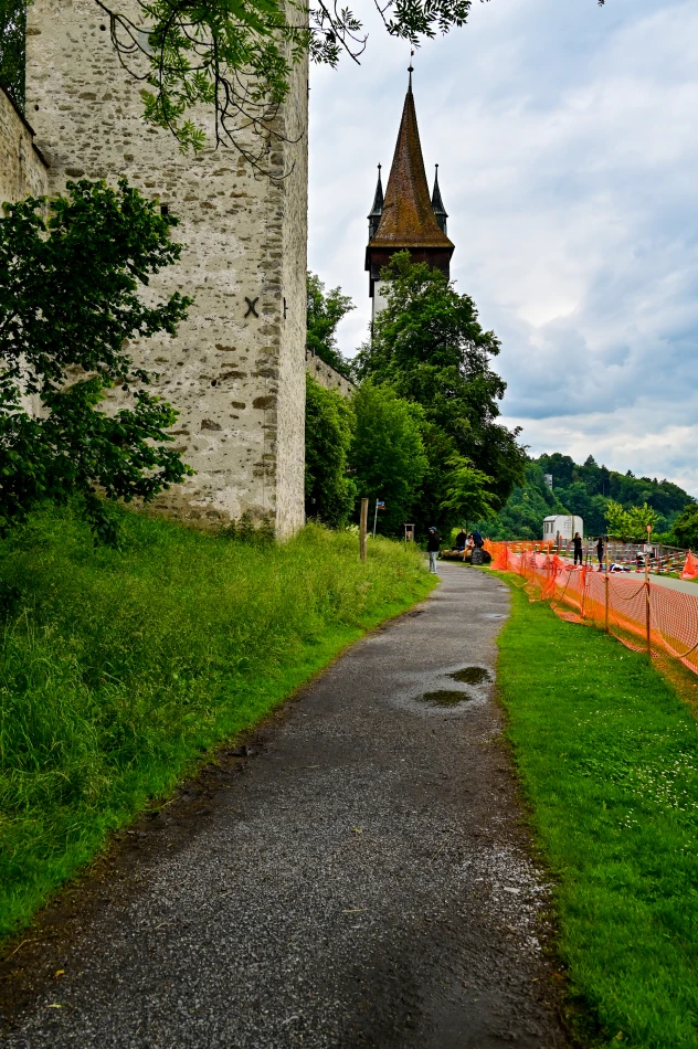 於15世紀完工的穆塞格城牆(Museggmauer,Google Map 位置圖)是琉森碩果僅存的城牆,城區大部分的防禦工事都於19世紀被拆除,可免費參觀。這城牆位於市區北方,目前有9座高塔,部分開放,某些區段的城牆做為人行步道,可以遠眺下方的琉森天際線以及遠方的琉森群山,例如:瑞吉山,是我蠻喜歡的琉森景點!