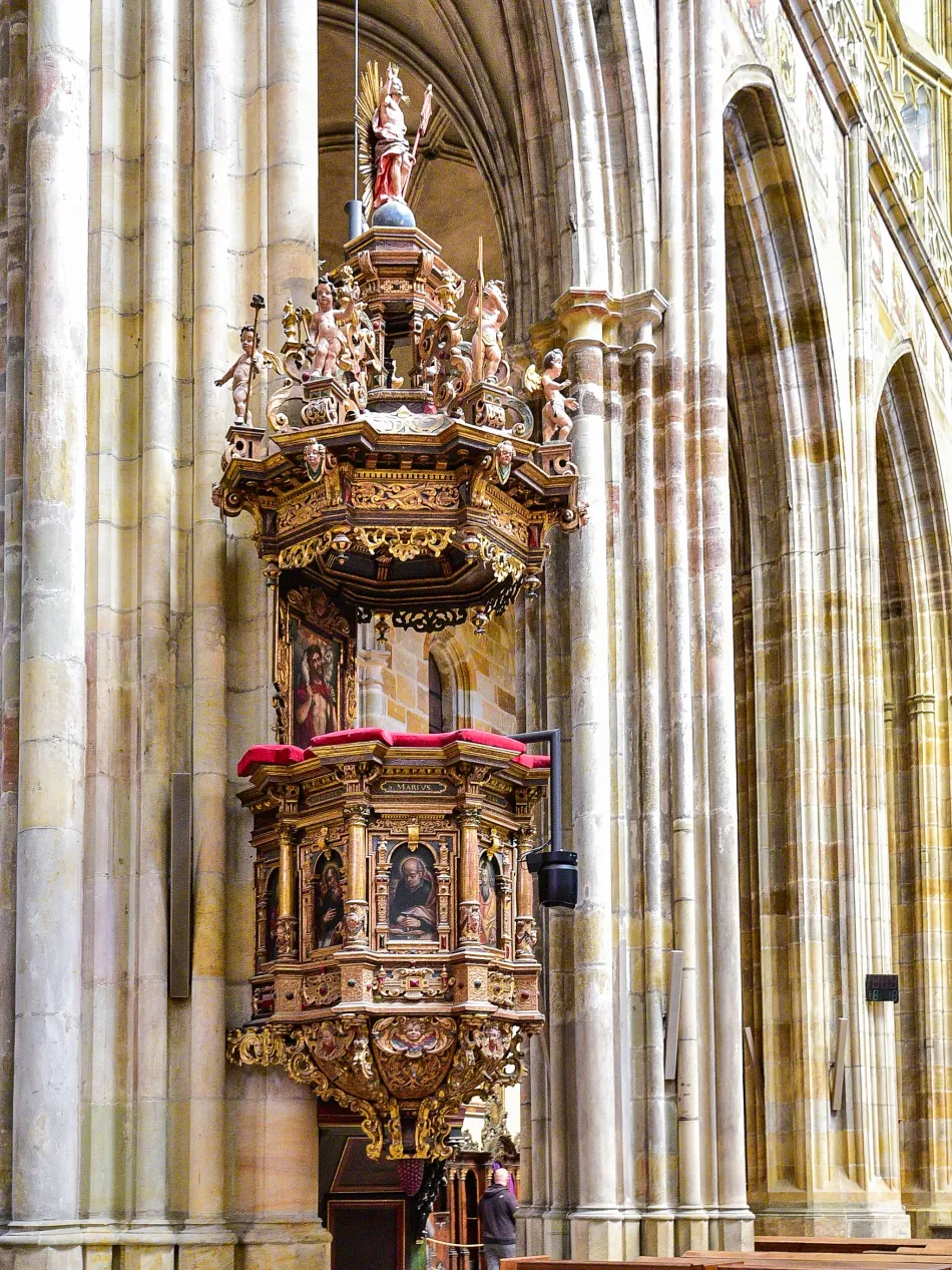 通常到布拉格城堡一定會進教堂參觀,裡面有慕夏的彩繪玻璃、楊.內波穆克棺木,也保存了波希米亞王冠,是城堡景點中最值得參觀的。教堂有南、北兩棟塔樓,我非常推薦到可以參觀的南塔,可以登高望遠眺望布拉格天際線。