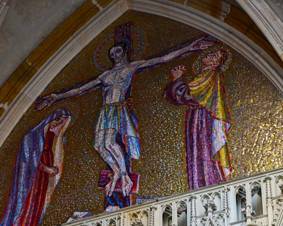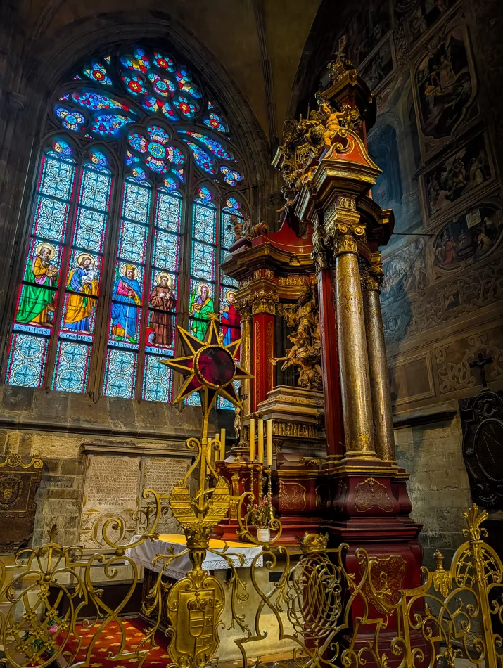 前述區域在教堂中殿附近,由那邊可以看到主祭壇以及入口上方的玫瑰窗,主祭壇後方的彩繪玻璃應該是描繪耶穌受難,玫瑰窗則是創世紀。這邊也有擺放一個華麗的陵墓,那是神聖羅馬帝國皇帝–斐迪南一世的棺木,聖維特大教堂的地下墓穴也是不少哈布斯堡王朝重要成員的長眠之地。