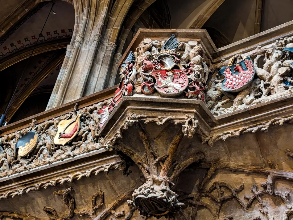 這邊還有一個有趣的木門(管風琴下方),主題是四福音書作者跟波希米亞的聖人(或國王),可以認真看一下!想知道四福音書的四位人物可以仔細觀察他們腳下的生物(人、獅子、老鷹、牛),可以很容易查到對應的人名。