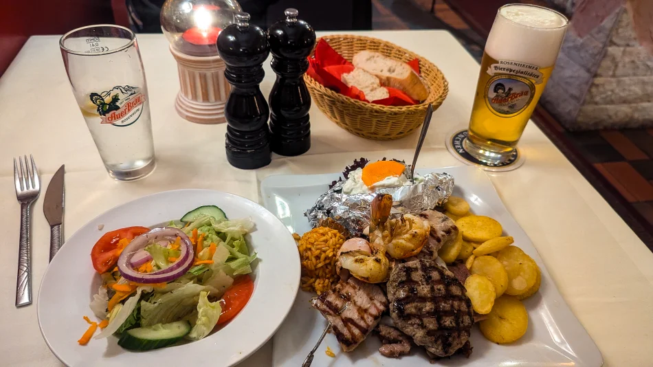 GP 小鎮讓我最驚豔的其實不是濕壁畫,在歐洲遊歷久了之後已經見怪不怪,而是火車站附近的希臘餐廳:El Greco(Google Map位置圖)。我這次是由瑞士到慕尼黑,瑞士物價貴到爆炸、只能隨便吃,在慕尼黑懶得找餐廳、都去之前去過的大酒館,El Greco 算是我整個行程中最不錯的用餐體驗,費用不會太高食物也美味,而且離車站超近,推薦給結束楚格峰行程後想大快朵頤的旅人。