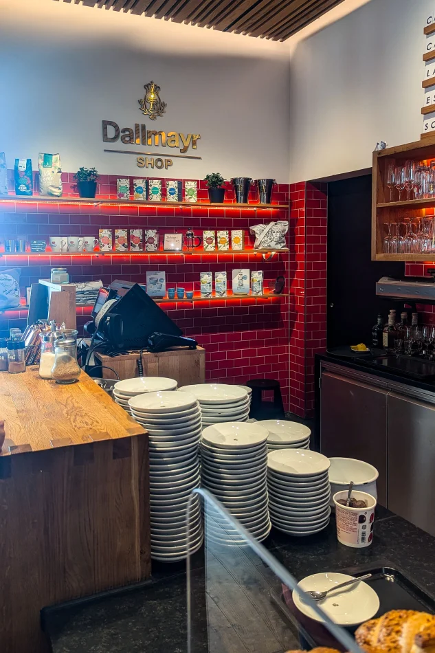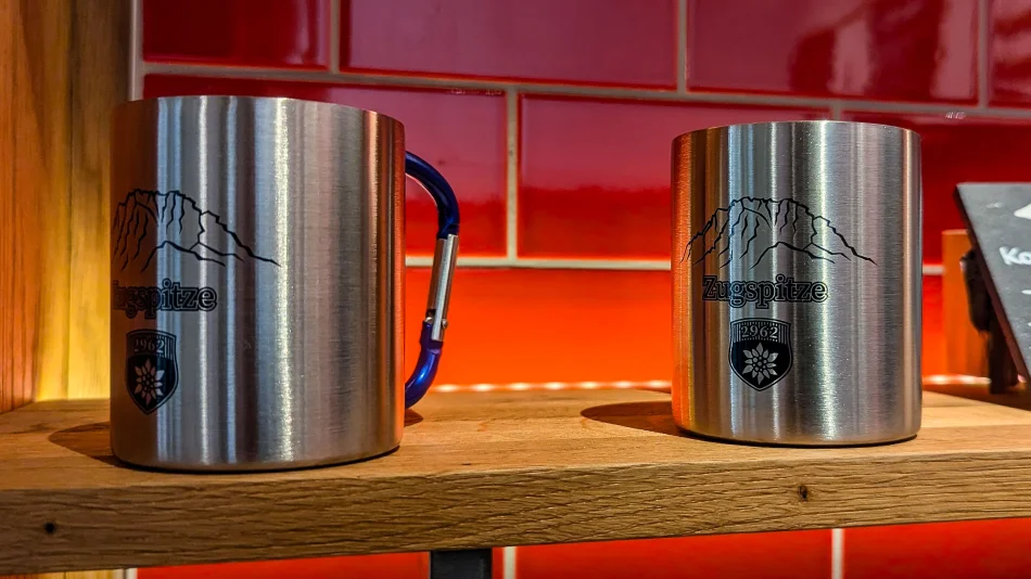 它的咖啡廳根本就是慕尼黑市區高級食材店–Dallmayr 的分店,除了使用它們的豆子製作咖啡,也有販售相關咖啡豆、茶包等等,還有聯名的杯子,另一個特別的是楚格峰鋼杯,價格不便宜就是了。