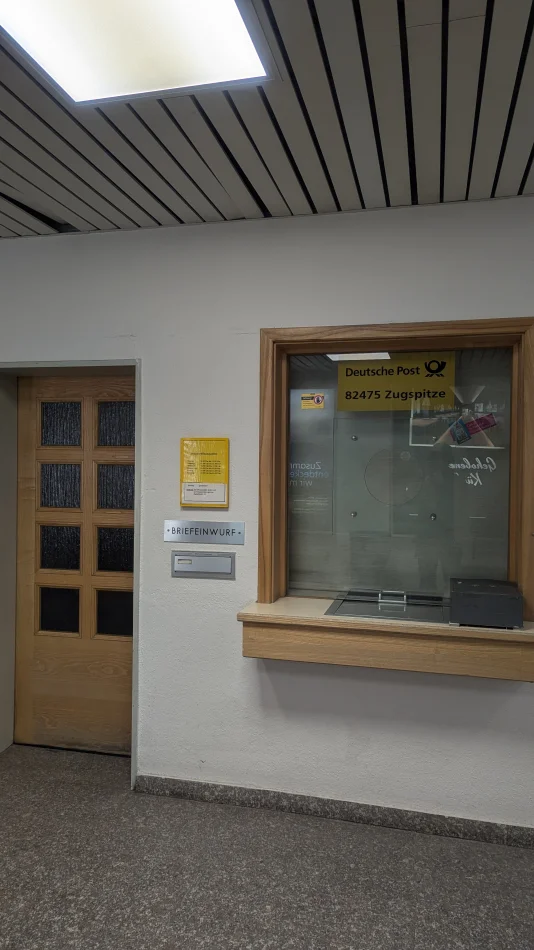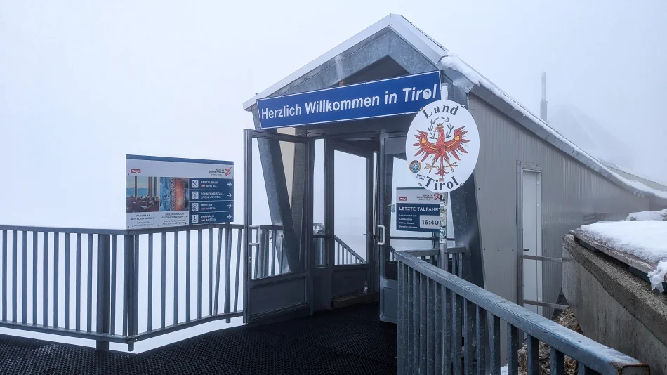 由這個平台經過有食物販賣部的慕尼黑小屋(Münchner Haus)就可以跨過以前的德奧邊境管制哨、一秒鐘到奧地利。現在德奧已經沒有邊境管制,管制哨已經廢除、沒人看守,可以四處走動,也可以搭纜車下到山下的奧地利(本文不介紹,我沒搭過)。有漆上奧地利國旗顏色的奧地利邊境非常明顯,在那邊的平台後可以跟奧地利國旗合照。