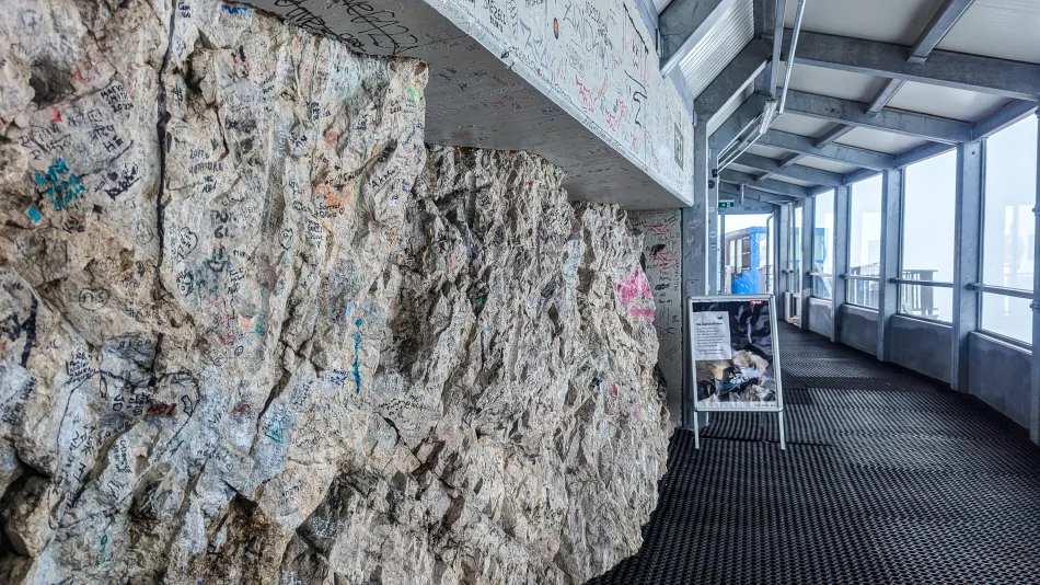 在餐廳區域逛夠之後就到了重頭戲:餐廳上面的360觀景平台,我來過楚格峰兩次,第一次晴天、第二次遇到白牆,等等看到的藍天白雲照片都是第一次造訪時拍的。景觀平台沒啥特別的,就是四處走走拍拍,要記得跟楚格峰的山頂十字架拍照,想爬上去也是可以,要非常謹慎就是了。平台靠近十字架的區域可以利用官方提供的攝影機拍照,然後由官網查看照片(相關連結)。