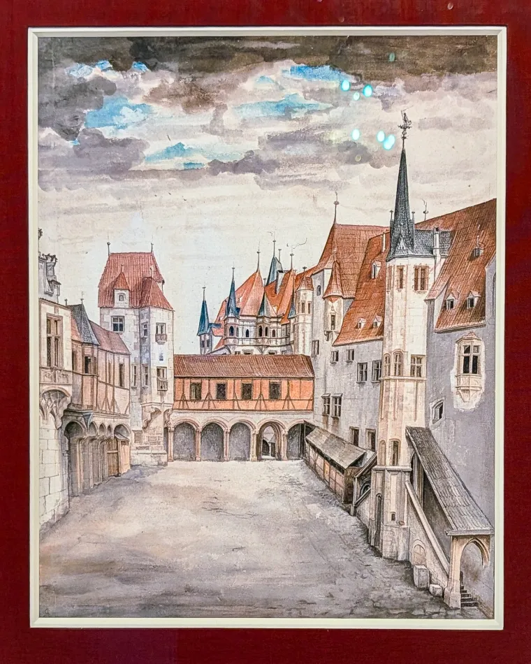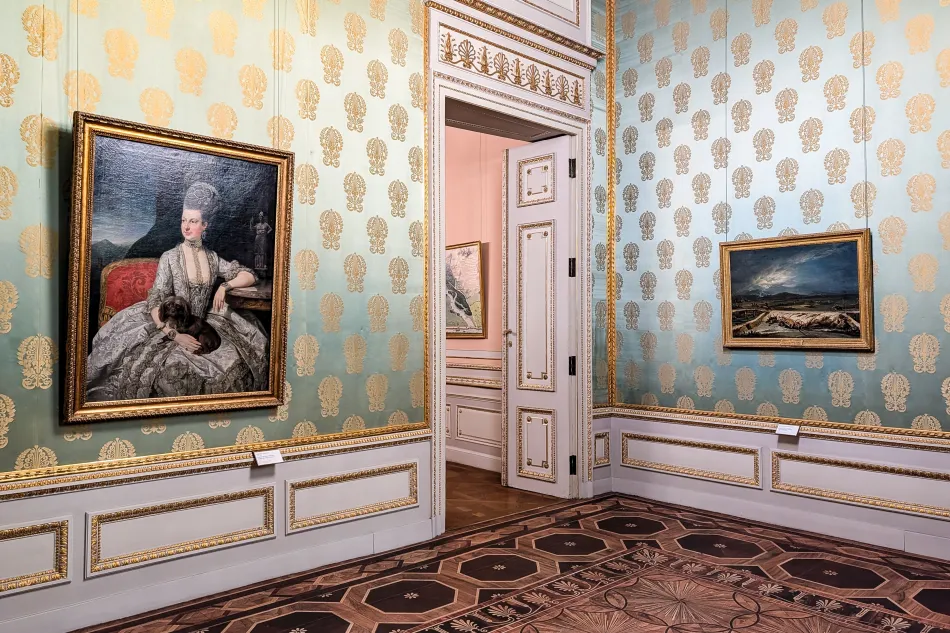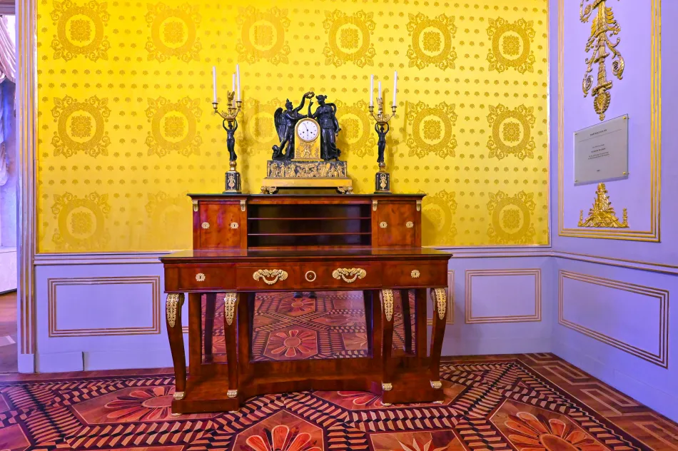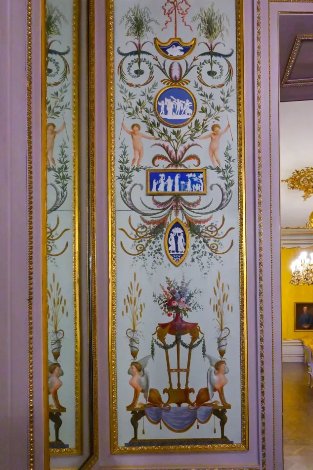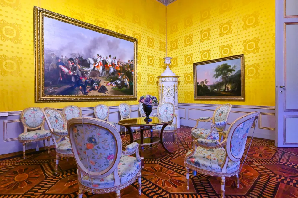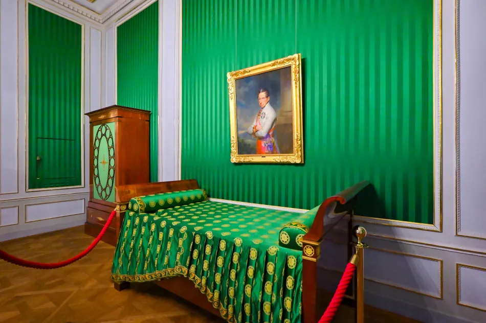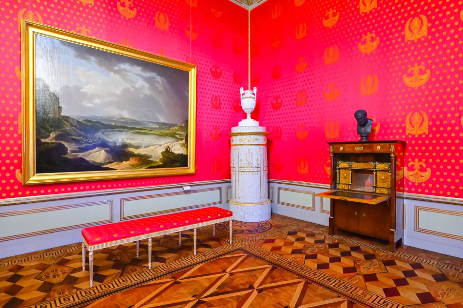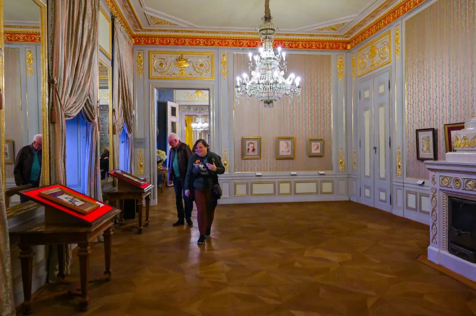 橢圓形房間也很特別,有橢圓形衣櫃與壁紙,導覽內容說…製作橢圓壁紙的工藝很複雜,原本原料有毒,修復時用其他原料來取代。臥室/辦公室則是卡爾大公的空間,有懸掛他的肖像,他於1847年染上感冒、在這個房間與世長辭。
